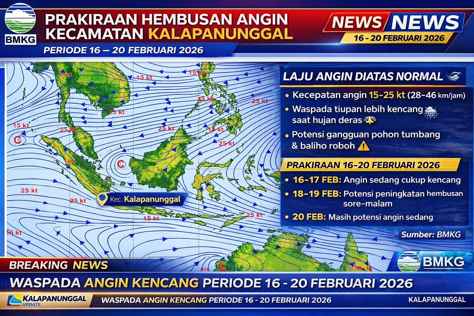 Untuk wilayah Kecamatan Kalapanunggal, pola angin baratan masih dominan dan diperkirakan bertahan hingga 20 Februari 2026.