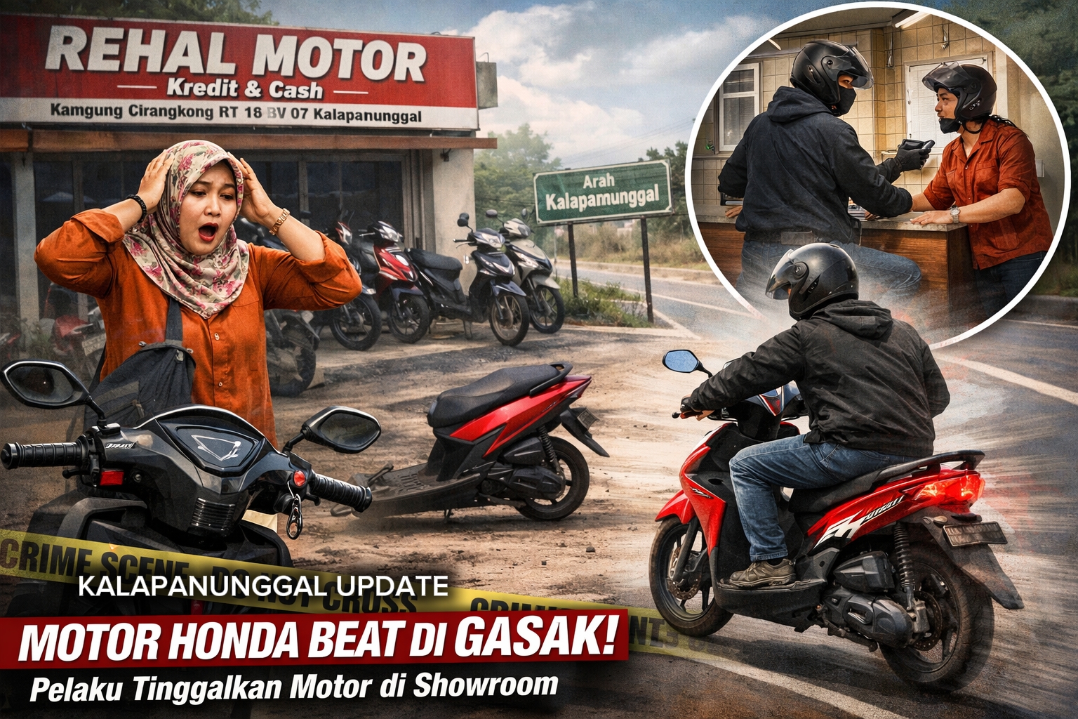 KALAPANUNGGALUPDATE.COM, Desa Makasari, Kalapanunggal. – ( 26/12/2025 ). Aksi pencurian sepeda motor dengan modus baru terjadi di sebuah showroom motor di wilayah Kecamatan Kalapanunggal. Peristiwa ini menimpa Showroom REHAL MOTOR yang beralamat di Kampung Cirangkong RT 18 RW 07, Desa Makasari, Kecamatan Kalapanunggal, pada Kamis siang, 25 Desember 2025.