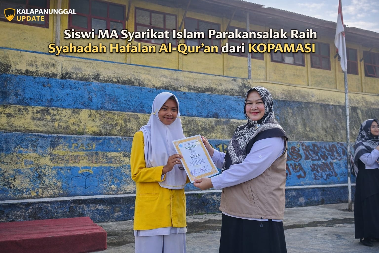 KALAPANUNGGALUPDATE.COM | MA SI Parakansalak — Prestasi membanggakan kembali ditorehkan oleh dunia pendidikan di Kabupaten Sukabumi. Salah satu siswi Madrasah Aliyah (MA) Syarikat Islam Parakansalak, Sulaeha, berhasil meraih Syahadah Hafalan Al-Qur’an dari Komunitas Penghafal Al-Qur’an MASI (KOPAMASI) setelah dinyatakan lulus dalam tes hafalan Al-Qur’an.