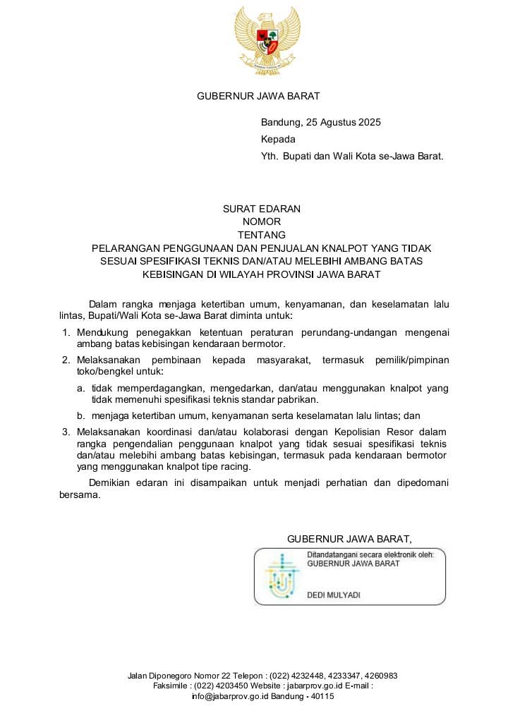 Melalui kebijakan ini, diharapkan warga Jawa Barat lebih sadar dan patuh terhadap pentingnya menggunakan knalpot yang sesuai standar—sebagai bagian dari upaya membangun lingkungan lalu lintas yang tertib, aman, dan nyaman bagi semua.
